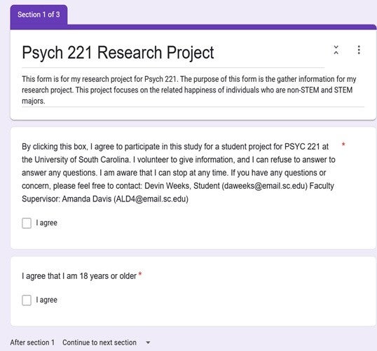 I had never created a survey before, so this was a first for me. This was a study my friends and I were very interested in so I sent them the link to the google forum. Once my friends completed the forum I had to go out and find people who were willing to complete the survey for me until I reached 30 participants. The creation of the survey helped me grow personally because I understood the importance of informed consent and various ethical research practices, reading and understanding data, and was able to do community research in a field that is closely tied with clinical psychology. My study found that the level of happiness someone endures does not reflect the major they picked. My study also found that the perceived course difficulty of majoring in STEM seemed to be harder than majoring in something that is non-STEM.